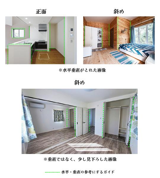 メインの写真(外観・リビング・寝室など)は、同じ画角でそろえると統一感が出ます。