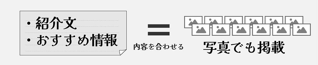 文章だと何十文字かかる説明や、施設の趣など言語化が難しいものも写真を組み合わせることでお客様に届けることが可能です。