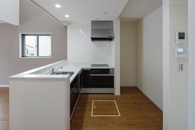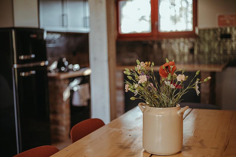 ②ダイニングテーブルの花にピントを合わせてキッチンをぼかしたイメージカット(近景)