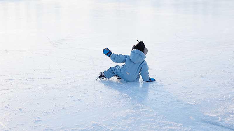転倒時に肌が直接氷に触れると、擦り傷や切り傷の原因になり大変危険です。必ず長ズボンを着用してください。