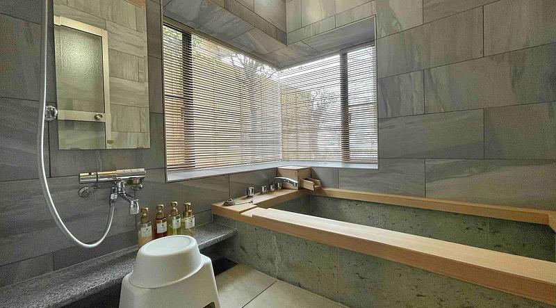 微黄色透明で無臭の塩化物温泉は、十和田石と檜木の浴槽、御影石とタイルを組み合わせた高級感溢れる浴室で楽しむことができます。