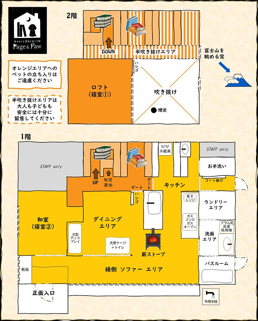 【ワンちゃんをお連れのお客様へ】 ★お1組様2頭までとさせていただきます。 ★トイレのしつけができているワンちゃんのみご同伴いただけます。 ★ワンちゃんに必要なもの(お食事・おもちゃ・クレートなど)は必要に応じてお客様にてご準備・ご持参ください。 ★ワンちゃんは寝具に乗せないようお願いいたします。 ★書籍エリア/ロフト/半吹き抜けエリアへのワンちゃん同伴はご遠慮ください。 ★破損・汚損につきましては修理代・クリーニング代等をご請求させていただく場合がございます。 【全てのお客様へ】 ★近隣にお住まいの方々のご迷惑にならないようご配慮ください。音の出る遊び(打ち上げ花火など)はご遠慮ください。 ★屋内の喫煙は固くお断りしております。加熱式・電子タバコを含め、喫煙されるお客様は屋外専用スペースをご利用ください。 ★施設内に設置の45㍑×1袋分のゴミは宿で処分いたします。それ以上のゴミはお持ち帰りいただいております。家庭ゴミの大量投棄が散見されるためご協力お願いいたします。