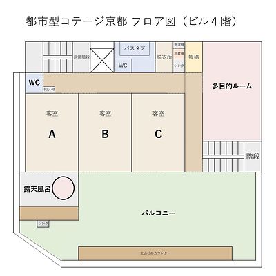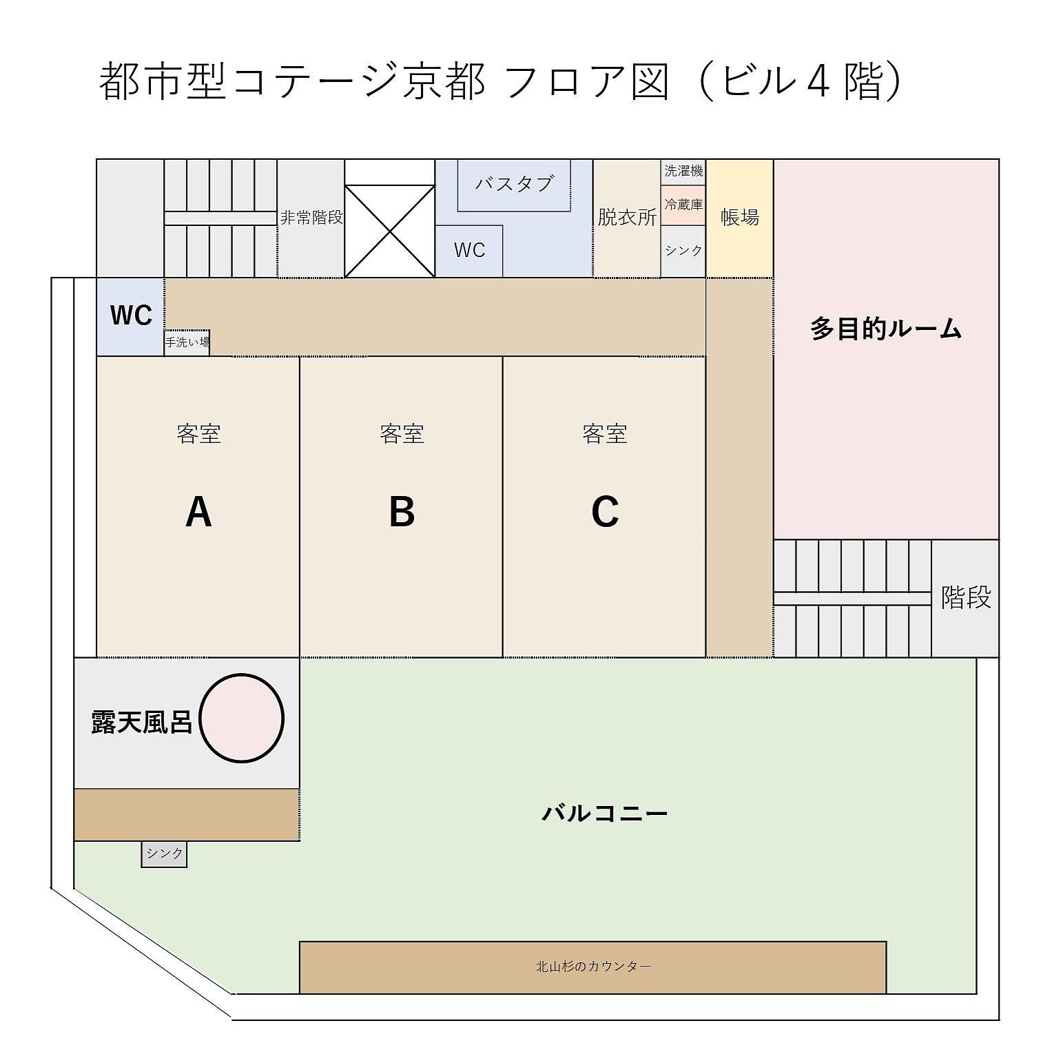 ご家族やご友人同士、サークル仲間など、さまざまなお客様に思い思いの時間を楽しんでほしいとの想いを持って、京都市の中心部にて都市型コテージを運営しています。 最上階にあたる4階部分を1フロア貸切りで、お子様連れ・大人数でもゆったりとお過ごしいただけます。 広いベランダ越しに眺望は抜群。季節ごとに変化する京都の街並みを一望いただけます。 有名な観光スポットにもアクセス良好な立地。 貸切フロアには露天風呂やガス火のバーベキューグリルなどの設備も揃っていますので プライベートな時間を満喫いただけます。 洗濯機を無料で使用いただけますので、連泊されるお客様にも好評いただいております。 また、赤ちゃんやお子様も大歓迎です。 オーナーは小さい子供がおり、お子様に優しい宿を目指しています。 赤ちゃんが夜泣きしたりお子様が騒いでも 全く問題ございません。 バルコニーのハンモックや二段ベッドは お子様に大人気です。 施設の正面には、キャッチボールやサッカーもできる、橘公園がございます。 大きなグラウンドだけでなく、お子様が飽きることなく楽しめる、ブランコや滑り台といった遊具もあります。 ご家族で身体を動かしたり、お子様が遊ぶ様子をバルコニーから眺めたりと、ゆったりとした時間をお過ごしください。 また公園の隣には、京都の南北を通る通りの名前にもなっている「智恵光院」があります。