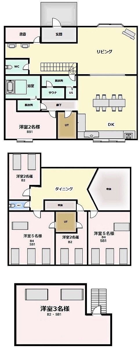 部屋割については間取り図を参照してください。宿泊人数によりクローズドルームがございます。 <ご宿泊料金> (税込) ○平日 (下記を除く日曜日~木曜日宿泊) 大人4名様より承ります。 一棟(4名様まで) 61500円 (追加・1名様料金)大人 7700円 子供(小学生) 5500円 幼児(3才から就学前) 3300円 ○金曜日・土曜日・祝日前日 2023年7月22日~7月31日 (GW・夏季お盆・年末年始を除く) 大人4名様より承ります。 一棟(4名様まで) 77000円 (追加・1名様料金)大人 8800円 子供(小学生) 5500円 幼児(3才から就学前) 3300円 ○夏季 2023年度 8/1~8/10日及び8/20日~8/31 シルバーウィーク 2022年度 9/16.17.23 大人6名様より承ります。 一棟 (6名様まで) 129800円 (追加・1名様料金)大人 9900円 子供(小学生) 5500円 幼児(3才から就学前) 3300円 ○GW(2023/4/28 ~5/6) 夏季お盆(2023/8/11~8/19) 年末年始(2023/12/29~2024/1/4) 大人6名様より承ります。 一棟 (6名様まで) 147400円 (追加・1名様料金)大人 9900円 子供(小学生) 5500円 幼児(3才から就学前) 3300円 *3才未満のゲスト様は無料です。 追加タオルセット(バスタオル・中タオル)550円 *BBQ(6600円)をご希望のゲスト様は事前にお申込みください。 ※天候等やお客様都合によりBBQ等のオプションの利用ができなかった場合は返金がございません。 チェックイン前日午前12時迄のご連絡で無料キャンセルが可能ですが、それ以降のご連絡は如何なる場合もご返金がございません。 なお、BBQのオプションサービスにはタープテントのお貸出し(3300円)もございます。ご検討ください。 ※BBQ等オプション・ご人数様の追加はチェックイン前日午前12時迄のご連絡で可能です。前日午前12時を過ぎますと通常金額プラス1100円となります。 なお、当日のご連絡ですとご準備ができないこともございます。予めご承知おきください。 【天災事変等について】 天災事変等の場合は、確定金額内での一年以内のご宿泊可能な日時の振替適用となります。(返金はございません) なお、交通機関が運行または一般道路の運行が可能な場合は規定のキャンセル料が発生 いたします。 ご了承ください。 上記は予約後に発生する予期せぬ事態からゲスト様をお守りすることを目的としています。