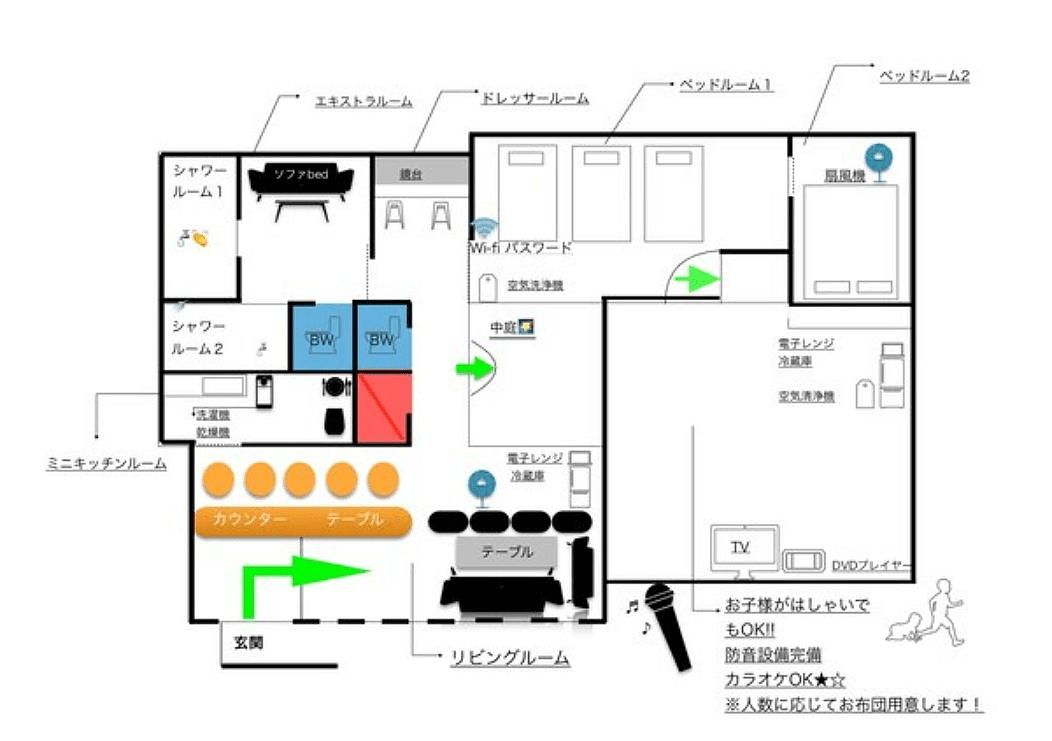 注意事項 ①宿泊者以外の出入りは原則禁止となっております。出入りがあった場合1人4,000円の追加料金が発生いたします。 ②近隣住民にご迷惑となる行為はお控えください。(打ち上げ花火・駐車場でのBBQ・大音量のオーディオ使用など) ③異常な汚れ・破損などがあった際は、追加清掃費用を請求する場合がございます。 ④21時以降は近隣住民へ迷惑にならないよう騒音等ご注意ください。
