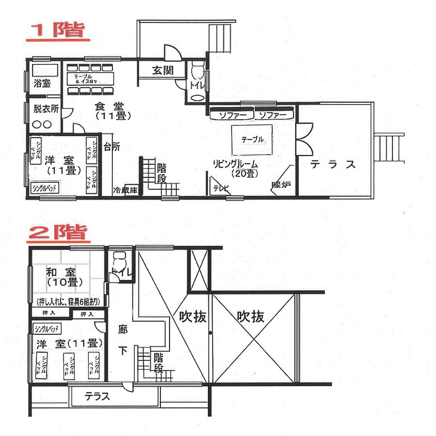 定員11名~14名の大型ログハウスをグループで1棟まるまる貸し切るプランです。 大型ログハウスは建坪50坪もあり、全てがゆったりとした間取りとなっています。 寝室が3部屋(洋寝室×2室、和寝室×1室)あるので、大人数グループ、仲良し2~3家族、3世代ファミリーでの宿泊に最適です。 (男女のグループや複数家族での宿泊でもプライバシーが確保できます) 解放感溢れる広い総吹き抜けのリビングや広いテラスでは、大人数のグループでも一同に介して楽しいひと時を過ごすことができます。 大型ログハウスの1棟貸しのため他のお客様との接触は皆無ですので、新型コロナ感染症の感染リスクは非常に低くなっており、感染予防策もしっかり実施していますので、安心してお泊りいただけます。 大型ログハウスの広いテラスでのBBQが人気です。 貸別荘のため、焼台の持ち込みは無料です。 炭焼きBBQ設備をレンタル(有料)していますので、これを利用すれば、面倒な炭の火付けや炭の後始末もこちらで実施しますので、食材・飲み物・焼肉のタレさえ準備すれば、お気軽にグランピング気分が満喫できます! BBQは宿泊棟の屋外テラスで実施しますが、屋外テラスは全棟屋根付きとなっていますので、雨天でもBBQを楽しめます。 [BBQセットのレンタル期間は4月~11月となっております] 車で5分の距離に、小さなお子様に絶大なる人気を誇る「軽井沢おもちゃ王国」があります。 貸別荘のため、お食事はご自分でご用意願います。料理をするための器具・食器類は揃っています。 台所には食品用ラップ、ティッシュペーパー、ふきん、台ふきんは備え付けあります。 調理用油、調味料、アルミホイルはありません。食材、飲み物、料理油、調味料はご自分でご用意ください。 また、貸別荘のため、パジャマ、バスタオル、タオル、歯ブラシ、歯磨きの備え付けはありません。ご自分でご持参ください。