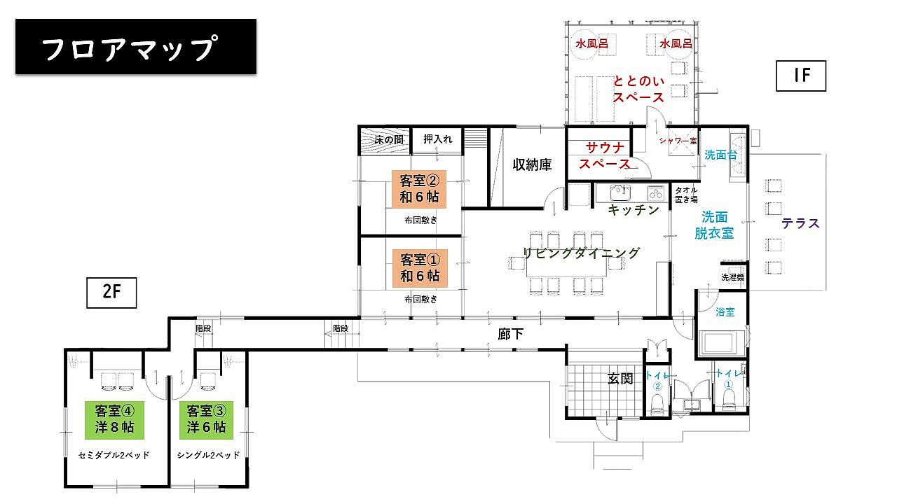 日本の伝統工法である古民家の性質を活かし、新旧を融合させて蘇らせたこのゲストハウスは、今注目されている古民家の趣を愉しむのはもちろんの事、大自然の中でサウナと山の天然水風呂でととのい、非日常な癒しを堪能できます。 VILLA IGASHIMAは、山林地帯にあり、周囲は杉や竹林に囲まれたところにあります。特に阿賀町五十島地域は、下越地方でも有数の豪雪地帯として知られ、その環境で長く耐えてきた伝統ある古民家です。そのような歴史ある建物の梁や柱・建具などを活かし、古き良き昔ながらの日本家屋を感じさせながら、モダンなデザインとの調和で新しいカタチの日本の風景を現代の里山に再現しました。 家族や友人と特別な一日をお過ごしください。 お部屋は洋室×2部屋、和室×2部屋の計4室ございます。洋室にはシングルベッド×2台、セミダブルベッド×2台、和室は2部屋で各3組ずつ布団を敷くことができます。 18帖ある広いLDKは10人一斉に集うことができ、75インチ大型TVもありますので、会議などのミーティングにも活躍します。 サウナはフィンランド式サウナで、半屋外ととのいスペースでは鳥の声を聴きながらゆっくり心地よい時間を過ごすことができます。 また、広いウッドデッキでの語らうも良し、ととのうのも良し!特別な一日をお過ごし下さい。