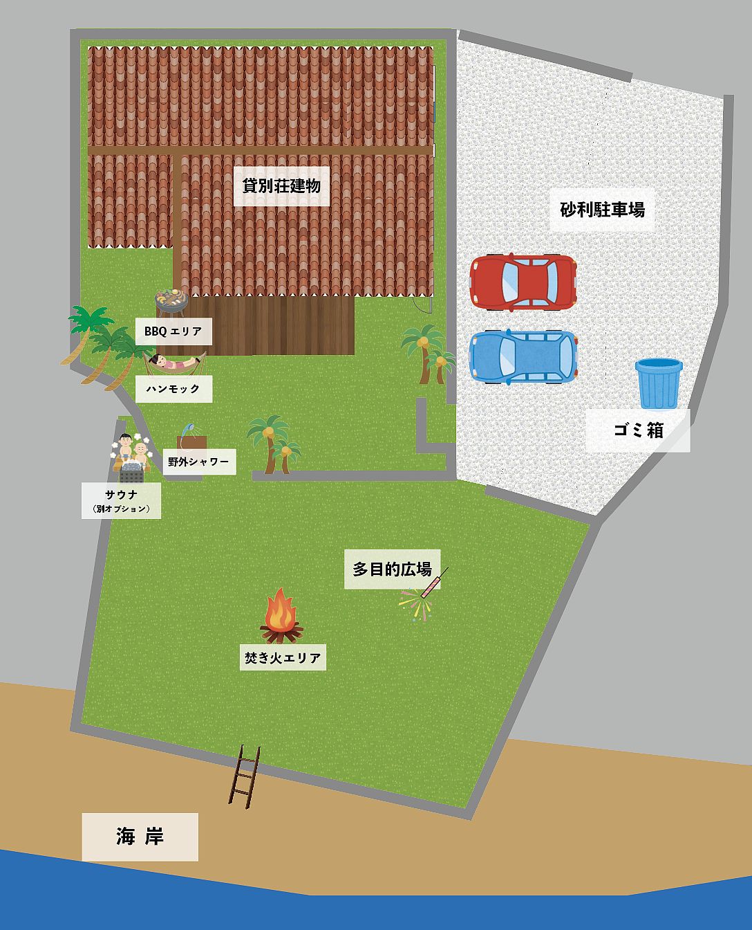 【SeasideVila-Waraku- 3つの特徴】 1、海まで徒歩0分の好立地♪ 2、隣に民家なしのプライベート空間 3、少人数での貸切が可能♪ 【BBQ機材の充実】 BBQ機材が充実しているので、持ってくるのは食材のみでOK!もちろん洗う必要なし追加料金もありません。 【サウナ始めました】 別途オプションでサウナがご利用できます。詳しくはお問い合わせください。 【近隣のお買い物が便利】 車で5分圏内にはスーパー/ドラックストア/ホームセンターなどが揃っているので忘れ物があっても安心です