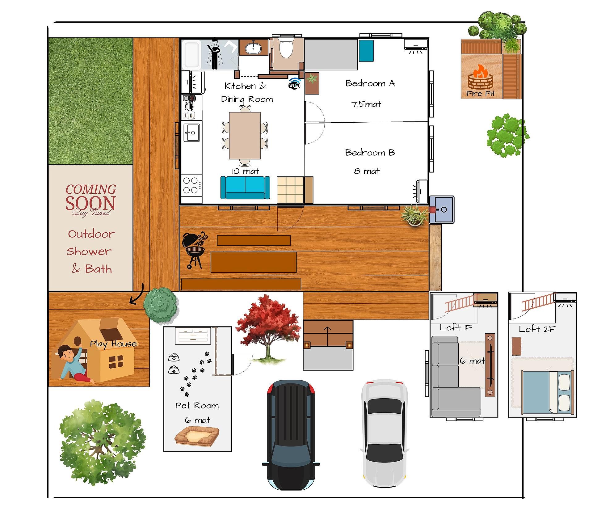 ご家族、友人、大切な人、ペットと一緒に自然の中のプライベートな空間で楽しいひとときをお過ごしください。 ◎完全貸切型のプライベート空間 1日1組限定で利用可能。家族、友人、大切な人、ペットとともに、気兼ねなく自然を満喫できます。 ◎家族やペットに優しい設備 赤ちゃん用おもちゃを完備し、子ども連れにも安心。 ペット専用ルームにはエアコン、安全ゲート、餌・水用ボウルを用意(※ペットは一部エリアに入室不可、事前連絡必要)。 ◎広々とした屋根付きデッキでバーベキュー メインキッチン隣接のデッキで、天候を気にせず楽しめます。火の管理はスタッフが対応するため、安全も確保。 【利用の際のポイント】 ▼食材と飲み物は持参制 到着前に地元スーパー(イオンタウン、オドヤ館山、おわりや)での買い物がおすすめ。 ▼ペット利用規定 トイレトレーニング済みであることが条件。事前連絡が必須。 自然に囲まれた癒やしの空間で、リラックスした時間を過ごしたい方にぴったりの宿泊施設です。 【施設概要】 キッチン ダイニングルーム ベッドルーム2室 バスルーム トイレ 洗面台 広いウッドデッキ 屋根付きバーベキュースペース AC付き8畳 AC付き6畳ペットルーム AC付き6畳ゲームルーム 焚き火エリア