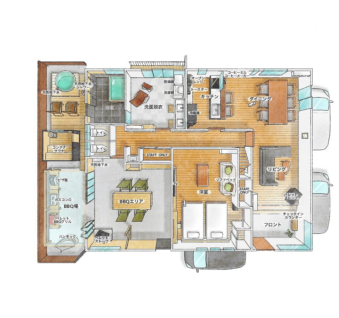 【ハウスルール】 Sauna Villa ITADORIサウナヴィラ板取(以下「当施設」という。)では、お客様に安全かつ快適にお過ごしいただくため、宿泊約款第10 条に基づき、以下のとおりハウスルールを定めております。 本ルールをお守りいただけない時は、宿泊又は施設のご利用をお断りいたします。また、本ルールを守られないことによって生じた事故について当施設は責任を負いかねますので、特にご留意下さい。 1.施設ご利用について (1) 施設内は玄関土間とBBQエリアを除いて土足厳禁です。 サウナエリアのウッドデッキは専用サンダルでご利用下さい。 (2) 施設内の非常口をご確認ください。 (3) 就寝時と外出時は必ず全ての施錠をお願いします。 (4) 施設内はBBQエリアの喫煙場所以外、電子タバコや水タバコ含め全て禁煙です。また、施設周辺や橋・河原等での喫煙や吸い殻のポイ捨ても厳禁です。 施設内にタバコの臭いや吸殻があり、当施設が利用できなくなった場合には、消臭清掃費に加え、宿泊できない期間の宿泊料に準じた賠償金を請求いたします。 ※ご宿泊中は外部webカメラにてご利用状況を確認することがあります。 (5) 宿泊予約されたお客様、人数でご利用ください。 予約したお客様以外の者の宿泊、異なる人数での利用・滞在は禁止させていただきます。 ※予約人数と宿泊人数が異なることが判明した場合、規定の追加料金と合わせて過料金を請求し、場合によっては警察へ通報いたします。 (6) 施設内では、薪・炭・キャンドルなどの火気使用を一切禁止いたします。 施設内での調理は、配備している調理器具をご利用ください。 BBQエリアの室内側でBBQをすると、自動火災報知設備が発報するので、必ず屋外の調理台の上で調理をお願いいたします。 (7) 当施設の許可なく営業行為(展示会・事務所・その他)等の目的で利用しないでください。 (8) パーティ等で騒ぎ立てることは固く禁止させていただきます。 (9) 屋外BBQエリアは21時から7時までの間は使用禁止といたします。21時までに屋内BBQエリアに移動したのち折れ戸を閉め静かにお過ごしください。 (10)ペットの宿泊は禁止とさせていただきます。 ※施設内へのペットの持ち込みが判明した場合は、消臭清掃費として50,000円をいただきます。 (11) 施設内に設置・配備しているインテリアや備品(トイレットペーパー・シャンプー・調味料等)を持ち帰らないでください。 ※備品等を持ち帰ったことが判明した場合、その同等商品の新品料金を請求し、場合によっては警察へ通報いたします。 (12) 施設内の家具、家電、寝具等は丁寧にお使いください。 万が一、破損・汚損した場合には速やかにお知らせください。 ※家具・家電・寝具・備品等の破損・汚損は、弁償金として同等商品の新品料金をいただきます。 ※嘔吐等による家具・寝具・備品等の汚損は、理由に関わらず上記弁償金に加え、消臭清掃費として50,000円を請求します。 (13)許可なく施設内の家具・家電・備品等を移動しないでください。 (14)ゴミは、①可燃ゴミ(燃えるゴミ)②不燃ゴミ(燃えないゴミ)③食品トレー(白色のみ)④ペットボトル ⑤カン・ビン に分別して、1FキッチンもしくはBBQエリアのゴミ箱に捨ててください。 ※ゴミ箱が一杯になったら、駐車スペースの大型ゴミ箱に移してください。 ※大型ゴミや普通ゴミとして処理できない残置物がある場合、処分費用を請求させていただきます。 (15) フェイスタオル、バスタオル、サウナ用タオルは最初にご提供した数のみです。追加・交換はできませんので、汚れた場合はご自身で洗濯・乾燥をお願いします。 (16) トイレは大小にかかわらず座ってのご使用をお願いします。 また、設置してあるトイレットペーパー以外は故障の原因になりますので絶対に流さないでください。 (17) 長期の宿泊利用により、居住に関する法律上の権利が発生するものではないことをご了承ください。 (18) 外出時は、サウナ、エアコン、ペレットストーブ、テレビ、照明などの家電製品の電源はお切りください。 (19) 当施設は落下や火傷の危険があるため、お子様をお連れになる場合は保護者が責任を持って管理監督をお願いいたします。 また未成年者のみのご宿泊はお断りいたします。 (20) 原則、チェックイン時間は15時、チェックアウト時間は10時です。 (21) 駐車スペースは、橋側(南東側)に2台分、あじさい街道側(南西側)に1台分あります。玄関ドアの開閉や歩行者や自動車の通行の妨げにならないようできるだけ当施設に寄せ、歩道にはみ出さないよう駐車してください。 特に丁字路の角付近は通行の妨げとなり大変危険ですので、駐車禁止エリアには駐車しないようお願いいたします。 ※駐車スペースで起きた事故につきまして当施設は一切責任を負いません。 (22)21時以降は全ての窓・扉を閉めて、屋内にて静かに夜をお楽しみください。 (23)コンテナサウナは21時までご利用頂けますが、 20時以降は騒音厳禁でお願いたします。 (24)サウナ及び水風呂は必ず水
