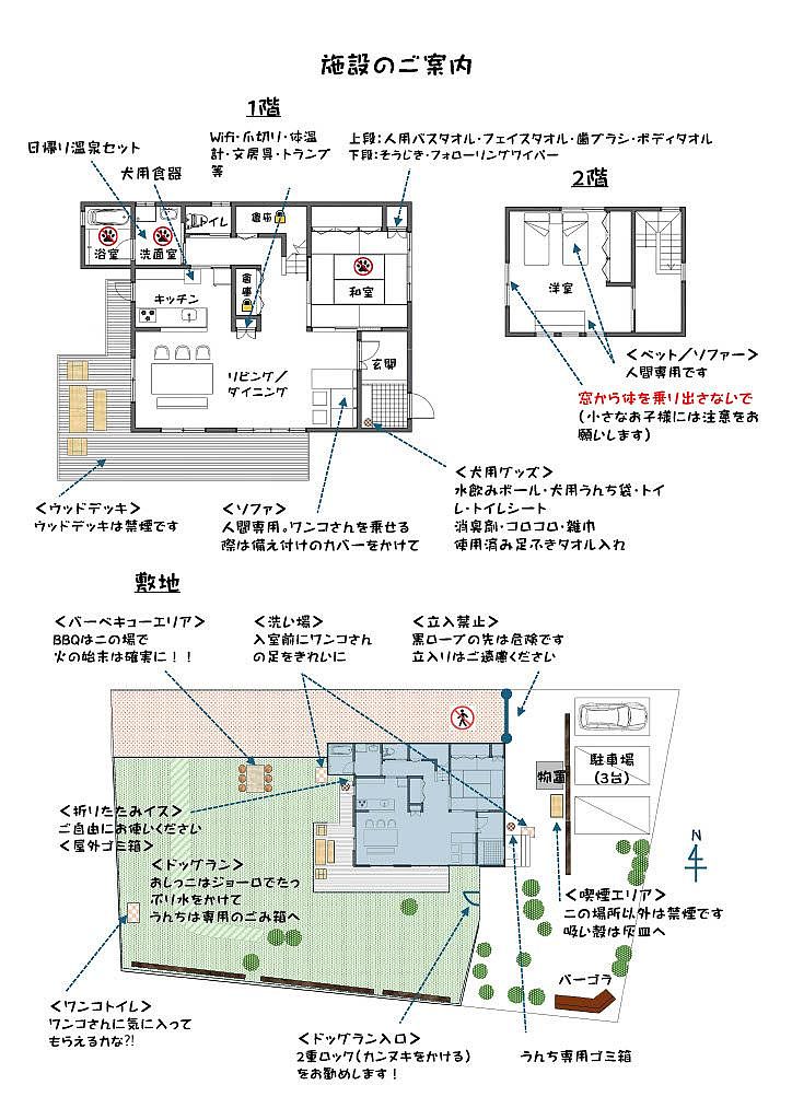 【利用規約・お願い】 ・チェックイン 15:00、チェックアウト 10:00となります。 ・宿泊定員は6名、ただしソファーベッドのご利用で7名まで利用可能です。 ・喫煙は所定の屋外喫煙所のみ可。 ・小型、中型犬(体重20kg程度まで)がご利用頂けます。 ・完全室内飼、ワクチン済、トイレ及び基本的な躾のできている愛犬がご利用できます。粗相の心配がある場合はパンツを着用させてください。 ・ ヒート中、ヒート後2週間はご利用いただけません。 ・和室、洗面室、浴室に愛犬を入れないで下さい。又、寝具(布団、ベット、ソファベット)に愛犬を乗せないでぐださい。ソファに乗る場合は備付のカバーを掛けてください。 ・ドックランの利用可能時間は7時~20時です。無駄吠えが続く場合は室内で落ち着かせてあげて下さい。柵の高さは1.2mです。脱走等に注意し愛犬から目を離さないで下さい。糞、尿の処理もお願い致します。 ・愛犬だけを残して外出しないで下さい。 ・施設、備品の破損、汚損があった場合は修繕費を請求させて頂きます。 ・施設内でのお客様、愛犬の怪我や事故には責任を負えません。携行品の破損や盗難も同様です。 ・2階の窓から身体を乗り出す行為は危険なので絶対にしないで下さい。お子様の行動にご注意願います。 ・焚き火、花火は禁止です。 ・周辺に居住の方々にご配慮願いたく、屋外での音楽はご遠慮下さい。特に日没後は静かな環境です。大声での会話等もお控え下さい。 ・BBQは所定の場所でお願いします。20時までに終了して下さい。火の始末を確実に行って下さい。強風時はできません。 ※自然豊かな環境です。虫除けや、愛犬へのダニ除けをされることをおすすめします。 ※冬期は路面の凍結・積雪に備え必ず冬用タイヤでお越し下さい。 ※セルフチェックインです。チェックイン時、リビングのテーブル上「ご宿泊者名簿」へのご記入と「ご利用案内・利用規約」をご一読下さい。