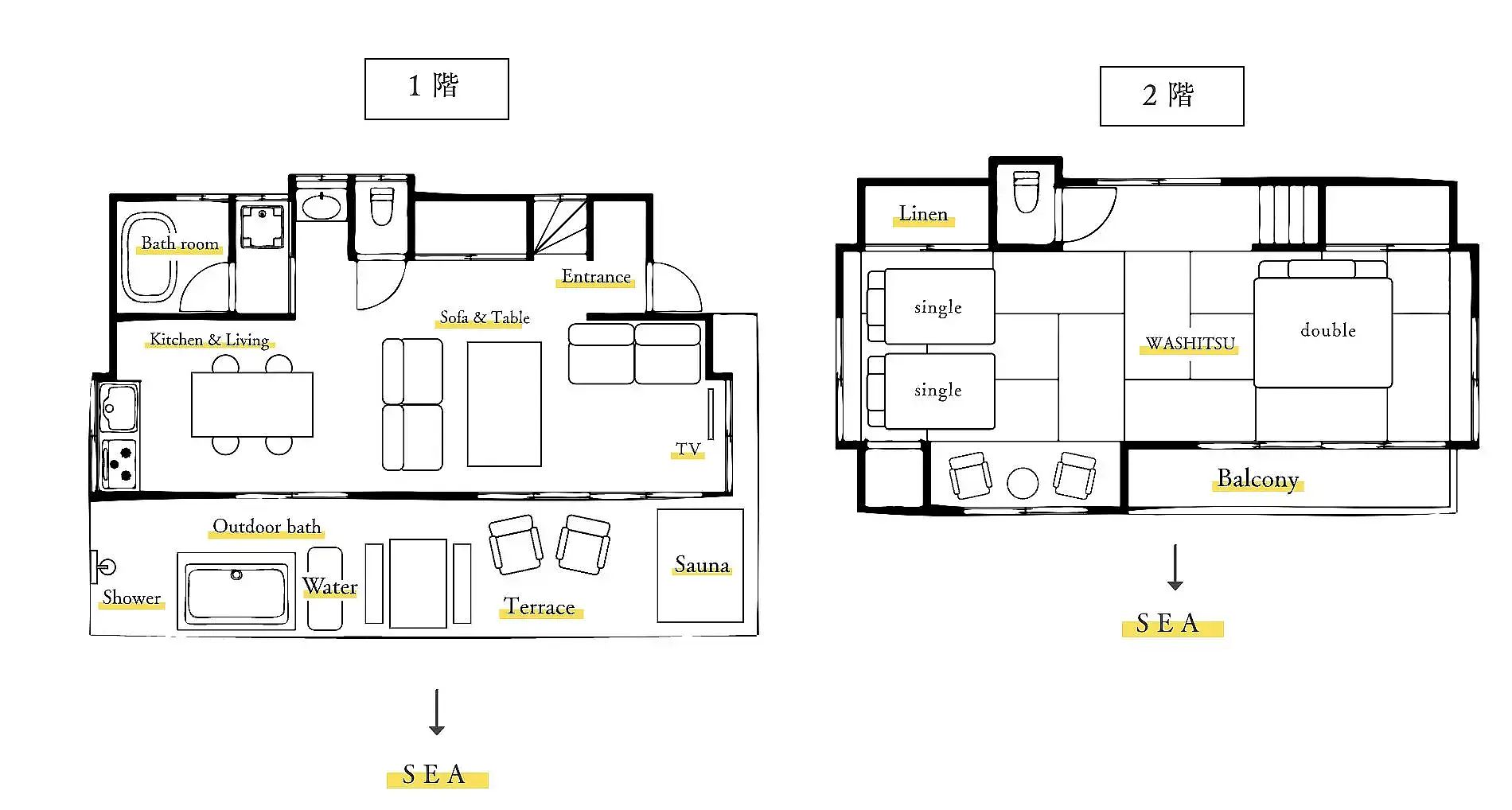 <平日・日曜料金> 34,000円+tax <土曜・祝前日料金> ※春休み期間(3月下旬〜4月上旬)、夏季期間(7月中旬~8月末)等 43,000円+tax <ハイシーズン特定日> ※年末年始、GW、お盆等 52,000円+tax <4名様以上でご利用時の追加料金> 1名様あたり追加料金6,000円+tax/人 ※ハイシーズン 1名様あたり追加料金8,000円+tax/人 <別途清掃費> 11,000円+tax ※お支払いは事前決済のみとなります。 ご予約完了後、クレジットカードのご請求書をお送り致します。 銀行振込をご希望の方はお申し付け下さい。 ◆宿泊料金例 ・平日4名様で宿泊の場合 基本料金 34,000円(+tax) +清掃費 11,000円(+tax)→計49,500円(税込) ※1名様あたり 12,375円 ・平日7名様で宿泊の場合 基本料金 34,000円(+tax) +追加料金(3名様) 6,000円(+tax)×3 +清掃費 11,000円(+tax)→計69,300円(税込) ※1名様あたり 9,900円 ・土曜6名様で宿泊の場合 基本料金 43,000円(+tax) +追加料金(2名様) 6,000円(+tax)×2 +清掃費 11,000円(+tax)→計72,600円(税込) ※1名様あたり 12,100円 ・ハイシーズン特定日6名様で宿泊の場合 基本料金 52,000円(+tax) +追加料金(2名様) 8,000円(+tax)×2 +清掃費 11,000円(+tax)→計86,900円(税込) ※1名様あたり 14,483円 *お子様料金について ・小学校生までは無料にさせて頂きます。 ・中学生以上からは大人料金とさせていただきます。 *ペットのご同伴について ペットとご宿泊が可能です。 1匹に付き清掃代金6,000円+tax頂きます。 *オプション料金 BBQオプション 機材レンタル:5,000円+tax 内容:テーブル・イス(ご宿泊者人数分)・バーベキューコンロ(電気式)・替え網・鉄板・トング *割引サービス WORK×VACATION 海を眺めながらお仕事。人混みを気にせず、心身ともにリフレッシュ。 夜は満天の星空を眺めながらの露天風呂×本格バレルサウナ。 波の音を感じながら天然水の水風呂と外気浴で極上の整い体験。 頑張る皆様に向けて お得なプランもご用意しております。 7泊以上のご予約10%OFF 28泊以上のご予約20%OFF キャンセル料 ・お支払い完了後48時間以内 →全額ご返金 ・お支払い完了後48時間以降〜チェックイン7日前 →50%のキャンセル料金 ・チェックイン6日前〜前日 →75%のキャンセル料金 ・当日 →100%のキャンセル料金 ・連絡なしの不泊 →100%のキャンセル料金 ご宿泊1週間以内のご利用人数変更(減員)は、キャンセル料(100%)の対象となりますので、予めご了承下さいませ。 人数変更に付きましては、必ずご利用日1週間前迄にご連絡下さいます様お願い致します。 ※返金は銀行振込にてさせていただきます。(クレジットでの返金不可)