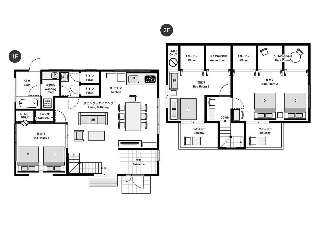 ◆施設情報 一棟貸切りの別荘です。 1F: リビングダイニングキッチン約20畳、洋室約8畳、トイレ2、洗面、浴室 2F: 洋室部屋2部屋(約6畳、10畳) 寝具:ダブルベッド5台、布団6組、ソファベッド2台(シングルサイズ) 駐車場; 3台 〇設備 <バーベキュー> ・バーベキューコンロ(ガス使用)、ガスボンベ、トング、椅子、テーブル ※BBQで使用する紙コップや紙皿、割り箸は各自ご用意ください。(施設設置のガラス製品のご使用は不可) ※BBQなどの野外施設のご利用は午後8時までです。 ※花火不可 <室内> 〇備品 <調理器具> 両手鍋 : 2 フライパン : 2 包丁 : 2 まな板 : 2 菜箸 : 2 キッチンバサミ : 2 ピーラー : 2 栓抜き : 1 缶切り : 1 お玉 : 2 フライ返し : 1 ボール・ザル大中小 : 5 台所ふきん <食器> お皿各種、お椀、茶碗、コップ、箸、プーン、フォーク、トング <寝具> ダブルベッド5台、布団6枚、ソファベッド2台(シングルサイズ) <洗面トイレ> トイレットペーパー ※パジャマはご持参ください