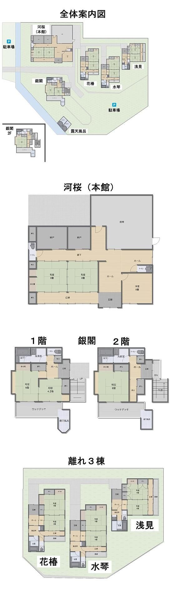 団体・グループ大人数貸し切りのどこか懐かしい古民家風コテージ ひとつ、ひとつが離れのコテージタイプ「リュウエイ」最大40様利用可能です。 伊豆の踊り子と河津桜の里、河津町。 1年中花が咲き誇り、海・山・川の自然の恵みが いっぱいの魅力あふれる町です。 美しい景観やグルメ、温泉もあり1日中楽しめます。 【間取り】 本館(河桜):大広間(8畳間二間)、キッチン(業務用)、トイレ×2、洋室、広縁 銀閣棟1F:舟形露天風呂、和室6畳、和室4.5畳、バス、トイレ、洗面脱衣所、ウッドデッキ 銀閣棟2F:露天風呂、和室8畳、バス、トイレ、洗面脱衣所、ウッドデッキ 花椿棟:和室8畳、和室6畳、バス、トイレ、洗面脱衣所 水琴棟:和室8畳、和室6畳、バス、トイレ、洗面脱衣所 浅見棟:和室6畳二間、バス、トイレ、洗面脱衣所 卓球