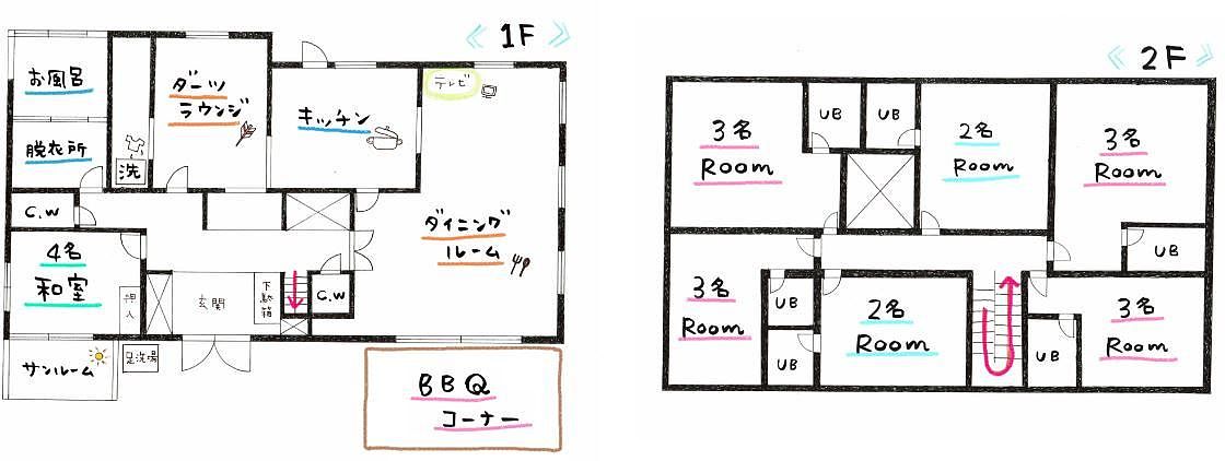 ※近隣への配慮のため、BBQのご利用は20:00までとさせていただき、それ以降のご歓談は窓を閉めた室内でお願いいたします。 また時間帯に関わらず、屋外で音楽を流すことは禁止とさせていただきますので、予めご了承ください。 ご滞在中は現地スタッフが見回りを行い、状況によっては退室いただく場合もございますので、素敵なご旅行が台無しになってしまわないよう、ご理解とご配慮をお願いいたします。 ※機械トラブルの原因となるため、お客様によるお湯の交換はご遠慮いただいております。 ご使用にあたり希望がある際は、お気軽に現地スタッフまでご相談ください。 ※お使いになった食器や調理器具については、次の方のためにもしっかり洗い、良く乾かしてから元の場所に戻してください。 ゴミの分別は【ビン】【カン】【燃えるゴミ(ペットボトル含)】の3種類のみです!ご面倒とは思いますが、ご協力お願いいたします。 ※備品を壊してしまった場合には、翌日以降にご宿泊になる方のためにも、必ずお電話にてご一報ください。 破損の状況によっては損害保険を利用いたしますが、お客様情報などが不十分な場合は適用にならず、全額弁償していただくことになる可能性もございます。 お客様への請求を出来るだけ少なくするためにも、必ずご報告いただきますようお願い致します。