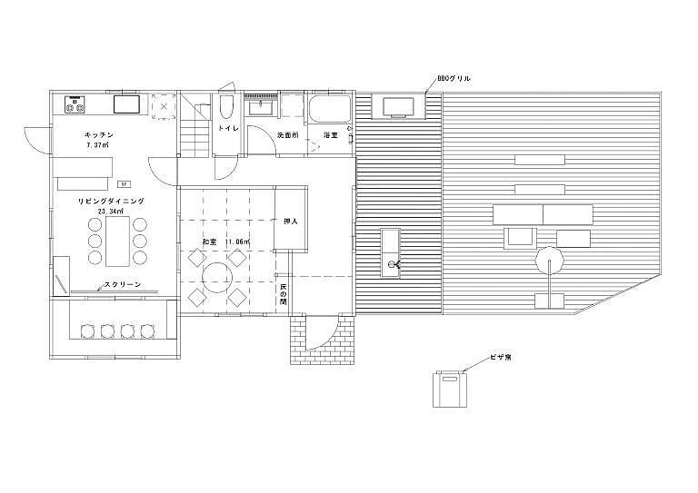 ■キッチン(冷蔵庫、電子レンジ、電子ケトル、食器類一式、キッチン用具一式) 衛生上、塩、胡椒、料理油はご用意しておりませんので、食料品と一緒にお持ち込みください。 ■リビングダイニング(5.1 チャンネルサウンドシステム, Blu-rayプレイヤー、プロジェクター、テレビ(Netflix視聴可)、ローテーブル) ■独立したお風呂1箇所(バスタブ&シャワー):ボディーソープ、シャンプー、コンディショナー)、洗面台 ■トイレ1カ所 【その他】 -洗濯機(洗濯洗剤) -ドライヤー2台 -バスタオル、フェイスタオルを各1枚x人数分 -無料ポケットWi-Fi -ピザ窯(庭) -BBQグリル