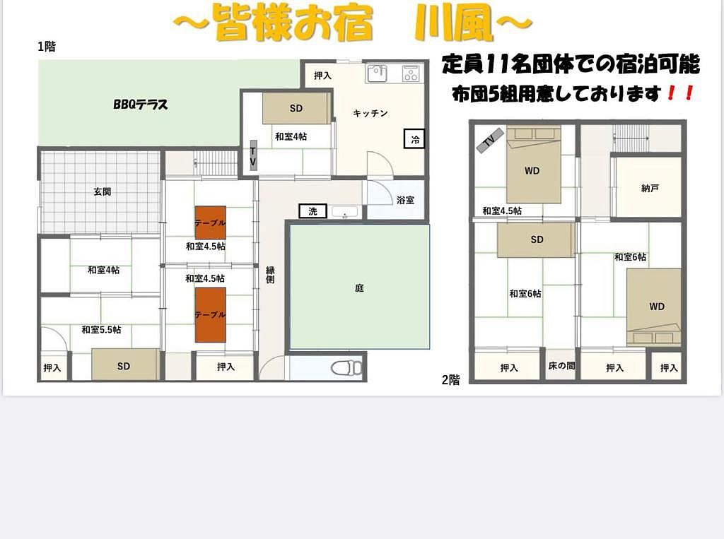 夏は、海・川・山を満喫、春、秋、冬は、温泉〜テラスBBQ(別途費用)を楽しめる古民家貸切別荘です。 目の前に日置川清流と美しい山の眺望があり、庭でにわとりを飼っています。安全です。 快適な旅のお手伝いをさせていただきます。 山からの酸素と川からのマイナスイオンにつつまれる特別な空間です。 築年数80年以上の古民家をそのまま住みやすく工夫した1軒家です。古民家につき、 多少の虫やホコリは、あります。 衛生面に神経質な方には不向きです。 BBQスペース(炭・コンロなどレンタル5000円〜もあります。)田舎暮らしを体験するのに最適です。 目の前の、川・海での釣りが満喫できます。 ◆ アクティビティ ・日置川清流でのリバーカヤック(開催あり) ・釣りや漁船クルーズ ・川・海でのフィッシング体験 アクティビティは相談・予約が可能です。 ◆ 周辺施設・温泉 冬場は特に人気の温泉めぐりが楽しめます。 ・リバージュ日置川(強アルカリの美人湯で有名) ・えびね温泉 アクセスも便利で、季節問わず快適に滞在できます。 ______________________ 間取り:6LDK 寝室1 ダブルベッド:2名 寝室2 ダブルベッド:2名 寝室3 シングルベッド、和布団シングル3、4名 寝室4シングルベッド:1名 寝室5シングルベッド、シングル布団2、3名