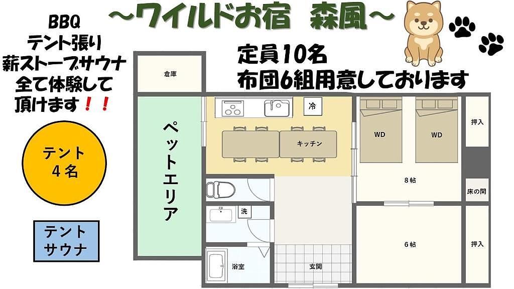 日置川インターを降りて1分の山のふもとにある1日1組限定のポツンと1軒家です。 ▼体験できるアクティビティ(オプション) ・BBQ体験 ・テント張り体験 ・薪ストーブのテントサウナ体験 山・川・海の遊びを思いきり楽しめるロケーションです。 ▼宿泊人数 ・建物+テント泊を含め最大14名(テント泊:最大4名) ▼周辺環境 ・近隣に温泉・スーパー・ホームセンターあり グループ、家族で貸切グランピングライフをお楽しみください。 【田舎の古民家の良さをなるべく残した施設です】 砂、ホコリなどは入ってきますし、自然の中にありますので、夏場は、虫もでますので衛生に神経質な方は、ご遠慮いただいた方がよいと思います。 ______________________ ベッドルーム1:ソファーマットダブル2台、 ベッドルーム2:布団6組 テント泊 コット、寝袋 4人 【オプションで色々楽しもう!】 ・薪ストーブテントサウナ&水風呂:15000円 大自然の中で整える! ・BBQ機材、炭一式レンタル:5000円 ・レンタルテント:5000円(11名以上は、無料レンタル) ※BBQ機材、テントの持ち込みも可能! ・ペット同伴可能 1匹1泊 1500円