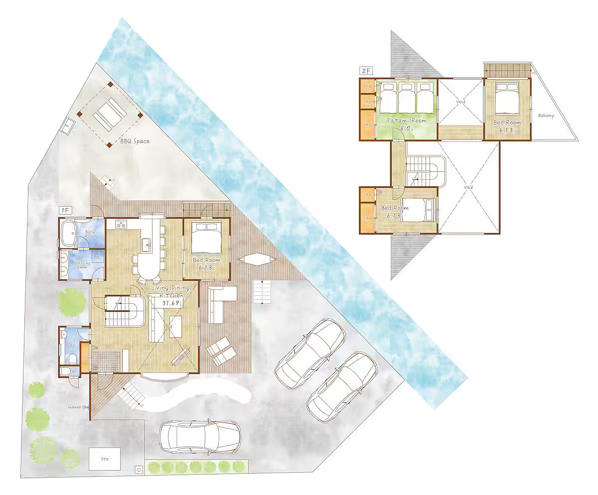 【屋内】 ・調味料 ・コーヒーメーカー:ドリップ式コーヒーメーカー ・ワイングラス ・ミキサー ・シャワージェル ・衣類用乾燥ラック ・ベビーチェア ・子ども用食器 ・ボードゲーム ・火災報知器 ・一酸化炭素検知器 ・消火器 ・救急箱 ・タオル類1名様につき1セット(フェイスタオル+バスタオル) 【屋外】 ・バーベキュー用具(グリル、炭、竹串・鉄串など) ※バーベキューグリル:木炭、ガス ・屋外ダイニングエリア ・屋外家具 ・ハンモック ・屋外シャワー ・屋外用リクライニングベッド ・ビーチ必須アイテム(ビーチタオル、パラソル、シート、シュノーケル道具) 【ペット用品】 ・トイレ ・デオシート ・マナーパンツS ・防水マット ・ウエットシート ・消臭スプレー ・食器・水入れ ・リード ・ゲージ 駐車場3台分
